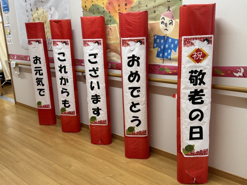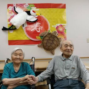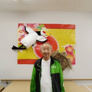 事務長手作りの長寿の壁紙の前でパチリ📷✨