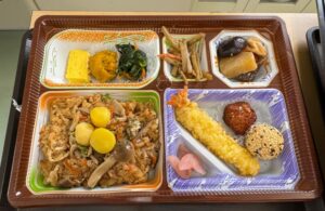 五目ごはんに季節の栗、大きなエビフライと肉団子、ごまだんご、季節の野菜のお煮しめなどなど。。おいしいと評判のお店の豪華なおべんとう🍱 本当においしそう✨💕