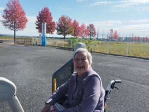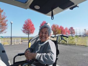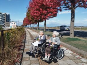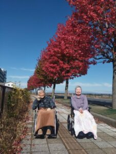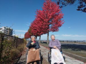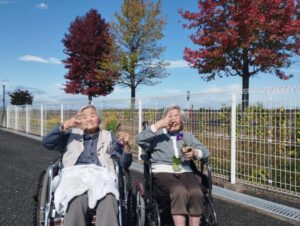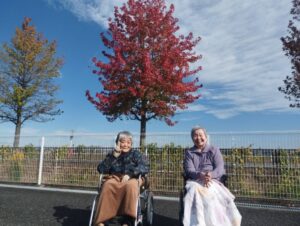 楓の葉っぱを持ってポーズをする利用者さん、お茶目でわ可愛らしいですね😊